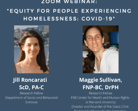 During this event, Maggie Sullivan, FNP-BC, DrPH (Research Fellow at the FXB Center and Director and Founder of the Oasis Clinic at Boston Healthcare for the Homeless) and Jill Roncarati, ScD, PA-C (Research Fellow, Harvard T.H. Chan School of Public Health’s Department of Social and Behavioral Sciences) will present on “Equity for People Experiencing Homelessness: COVID-19.”