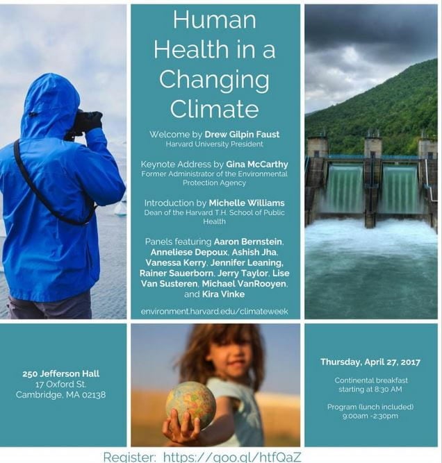Harvard President Drew Gilpin Faust, Harvard Chan Dean Michele Williams and the former Administrator of the Environmental Protection Agency, Gina McCarthy, also spoke. The Harvard Global Health Institute and the Harvard University Center for the Environment (HUCE) sponsored the event as part of Climate Week at Harvard which aims to give the Harvard community and the interested public increased access to some of the best scholarship related to climate change. The calendar for the week can be found here. Go here for individual videos of all the sessions of the day, which former US Vice-President Al Gore recommended in a Tweet.