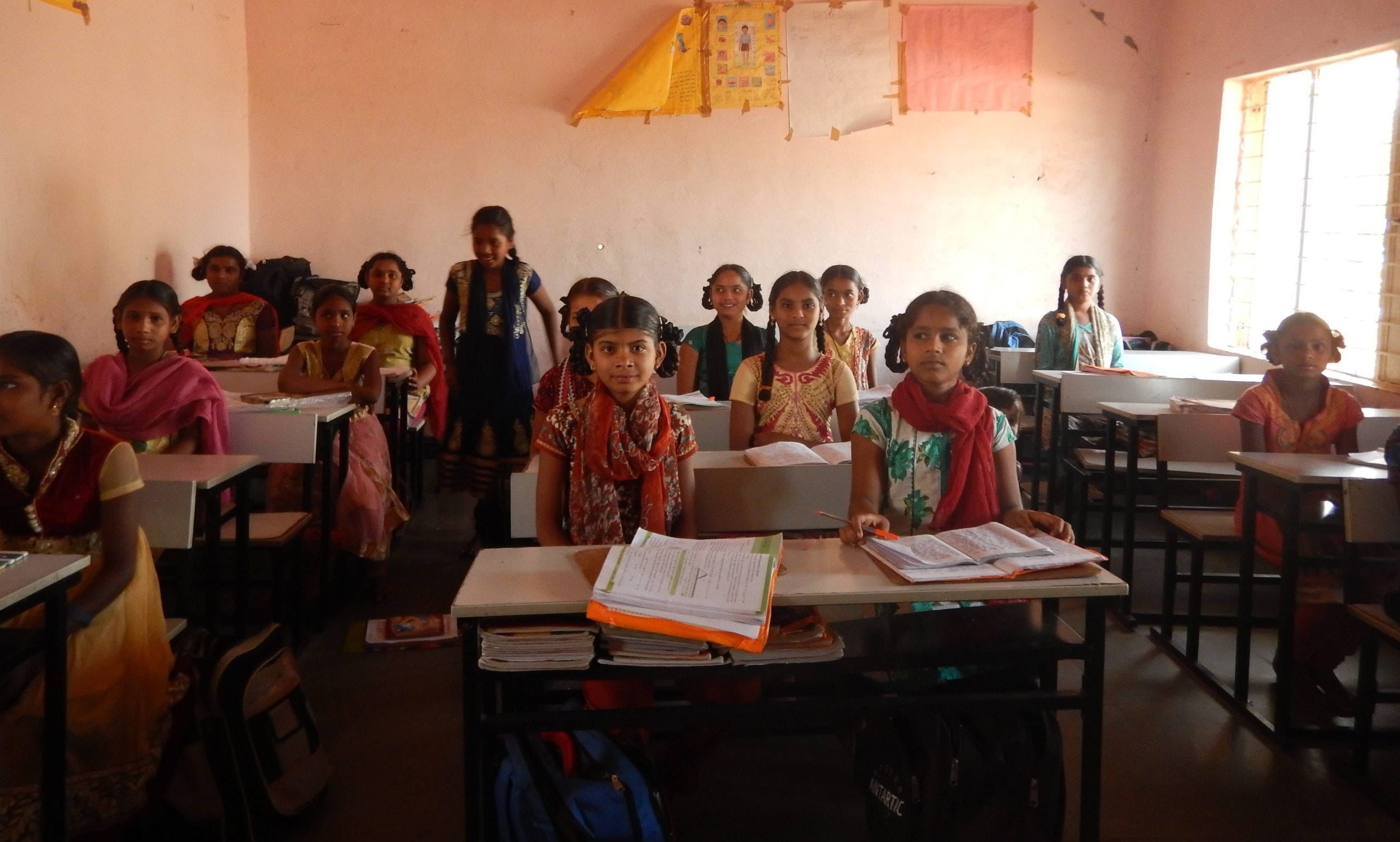 Cute Indian schoolgirls seated at desks