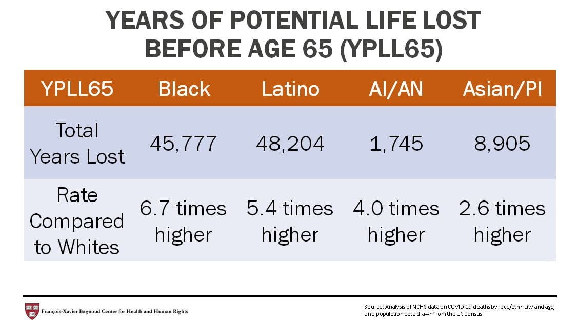 Early local media reports brought to national attention the disproportionate number of Covid-19 cases and deaths among Black and Hispanic people, typically comparing the proportion of cases and deaths in the area by reported race/ethnicity to the racial/ethnic composition of the population in the area. Lack of detail in national data made further analysis difficult. Newly released data by the NCHS make it possible for the first time to explore with national data whether Black, Latino, American Indian/Alaska Native, and Asian and Pacific Island populations are dying at younger ages of Covid-19, as well as in disproportionate numbers. The study examines age-specific mortality rates by race/ethnicity and calculates its impact using Years of Potential Life Lost (YPLL).