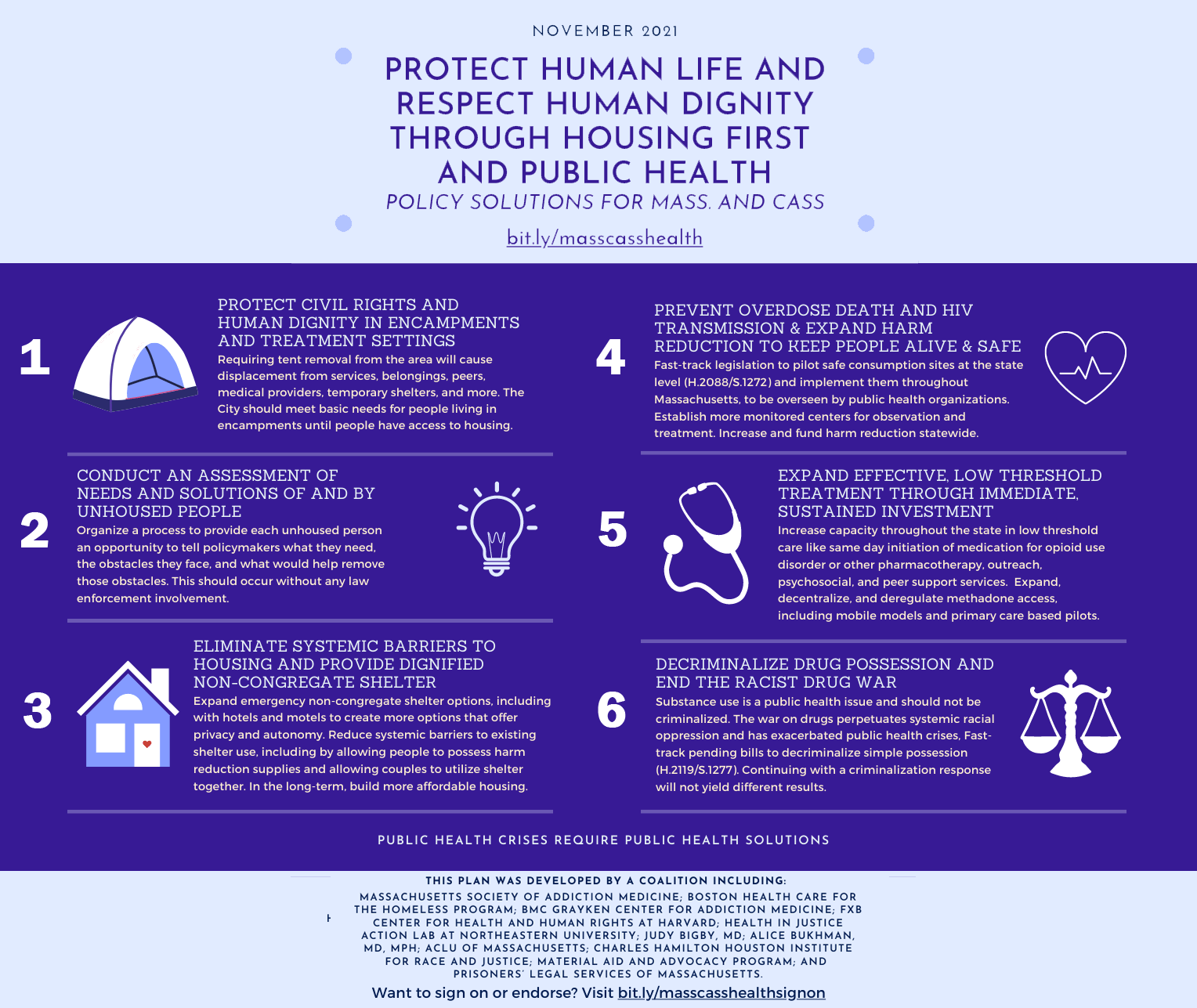 The Public Health & Human Rights for Mass and Cass Coalition includes: the Massachusetts Society of Addiction Medicine; Boston Health Care for the Homeless Program; BMC Grayken Center for Addiction Medicine; FXB Center for Health and Human Rights at Harvard; Health in Justice Action Lab at Northeastern University; Judy Bigby, MD; Alice Bukhman, MD, MPH; ACLU of Massachusetts; Charles Hamilton Houston Institute for Race and Justice; Material Aid and Advocacy Program; and Prisoners’ Legal Services of Massachusetts.