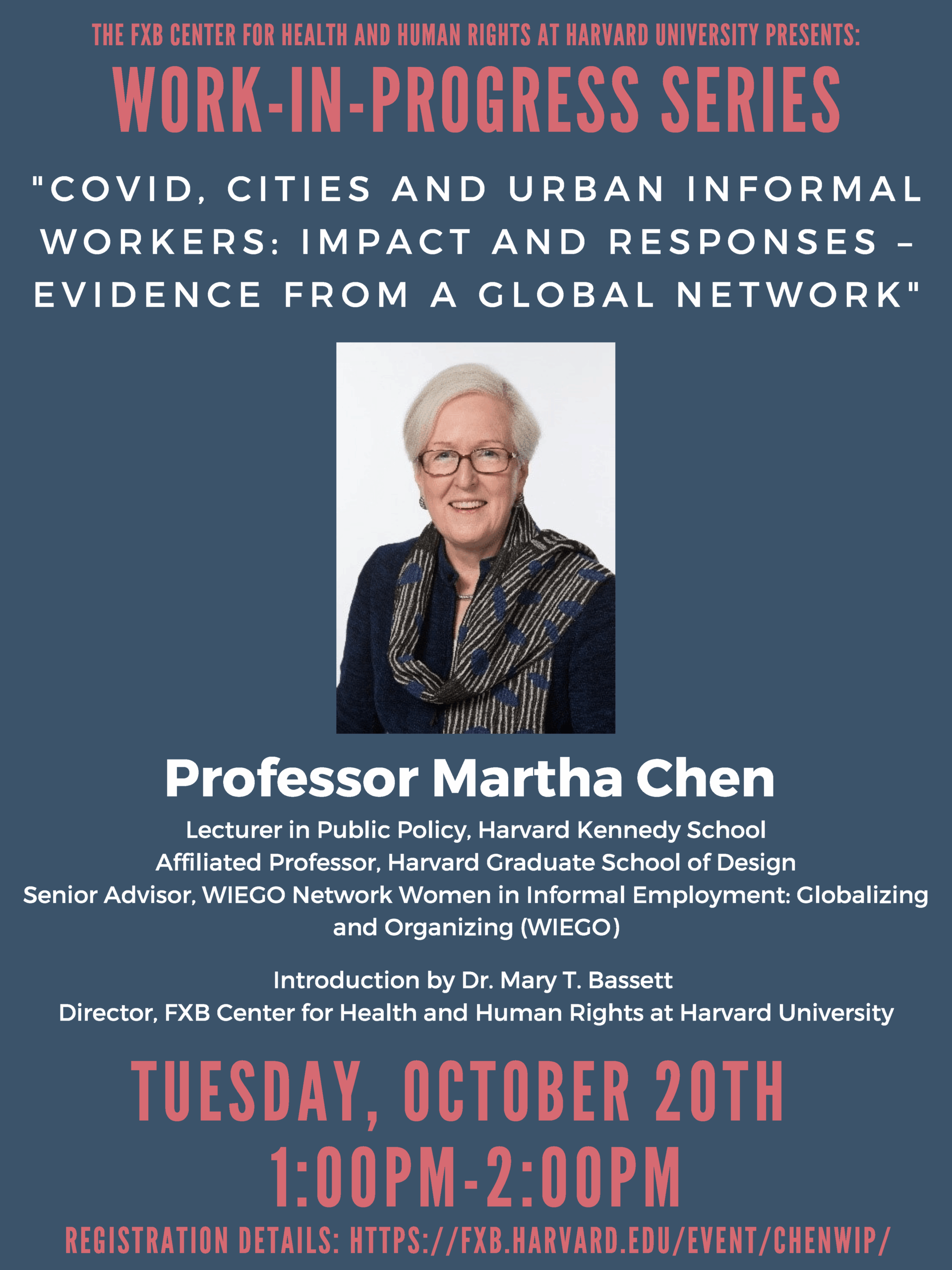 During this event, Professor Martha Chen will present “COVID, Cities and Urban Informal Workers: Impact and Responses – Evidence from a Global Network.”