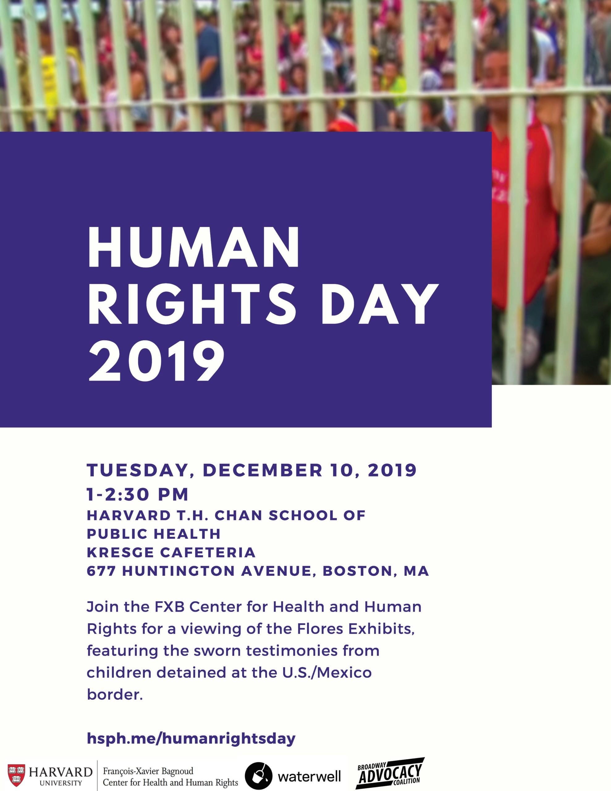 In recognition of Human Rights Day, please join the FXB Center for Health and Human Rights for a special viewing of The Flores Exhibits, a project created by Waterwell and Broadway Advocacy Coalition. In this series of short videos, artists, organizers, lawyers and immigrants read sworn testimonies of children detained at the U.S. / Mexico Border in June 2019.