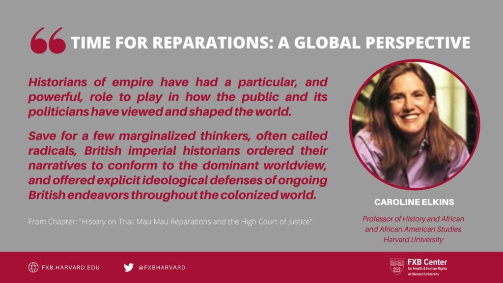 On Friday, Dec. 10, International Human Rights Day, the FXB Center will host a conversation on “Time for Reparations: A Global Perspective.” The book includes case studies of state injustices from around the world—from slavery to forced sterilization to widespread atrocities—and interdisciplinary perspectives on the potential impact of reparations.