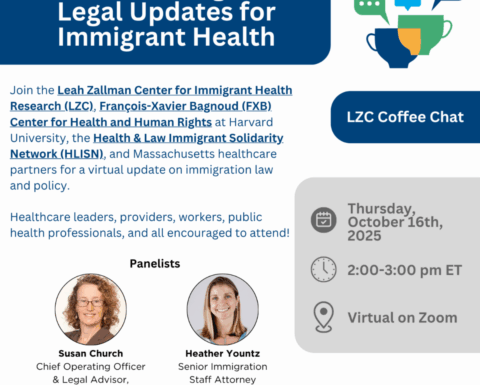 Join the Leah Zallman Center for Immigrant Health Research (LZC), François-Xavier Bagnoud (FXB) Center for Health and Human Rights at Harvard University, the Health & Law Immigrant Solidarity Network (HLISN), and Massachusetts healthcare partners for a virtual update on immigration law and policy from panelists Susan Church, Chief Operating Officer & Legal Advisor at MA Office for Refugees and Immigrants (ORI); and Heather Yountz, Senior Immigration Staff Attorney at Massachusetts Law Reform Institute.