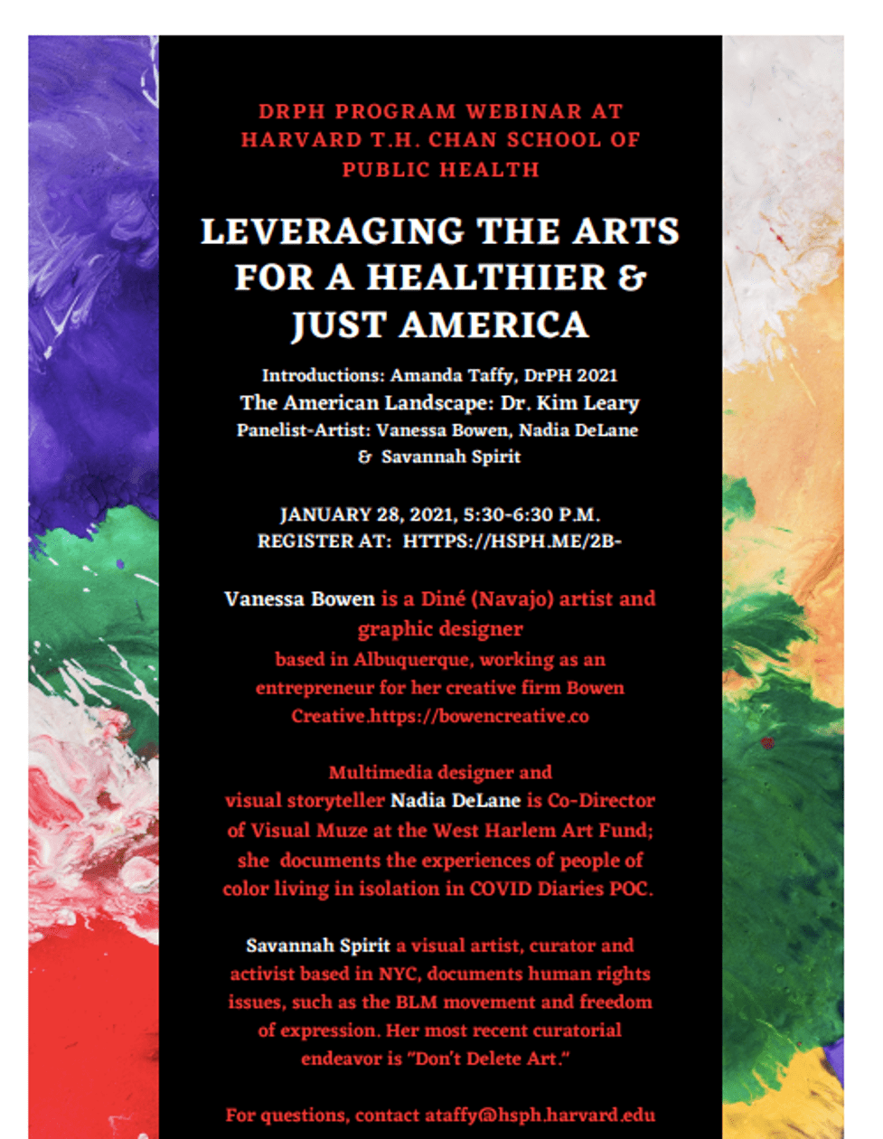Motivated by the need to help the nation charter a pathway for an American recovery, DrPH Candidate and FXB Center for Health and Human Rights Fellow Amanda Taffy is working on a thesis entitled, The Role of the Arts During COVID-19: Gendered Expressions of Resilience & Empowerment. With the help of faculty from the FXB Center for Health & Human Rights at Harvard University, Harvard T.H. Chan School of Public Health and the Harvard Kennedy School of Government, this thesis aims to understand artists’ potent role during COVID-19, particularly on vulnerable populations. On January 28th, 2021, the Doctor of Public Health Program at the Harvard T.H. Chan School of Public Health will sponsor an Art Seminar, “Leveraging the Arts for a Healthier & Just America.”