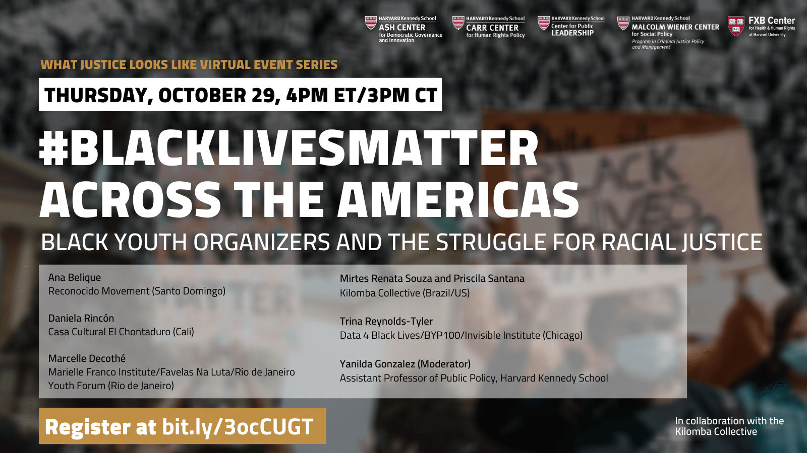This event is sponsored by Ash Center for Democratic Governance and Innovation, Carr Center for Human Rights Policy, Center for Public Leadership, FXB Center for Health and Human Rights, and the Program in Criminal Justice Policy and Management at the Wiener Center for Social Policy, and produced in collaboration with the Kilomba Collective.