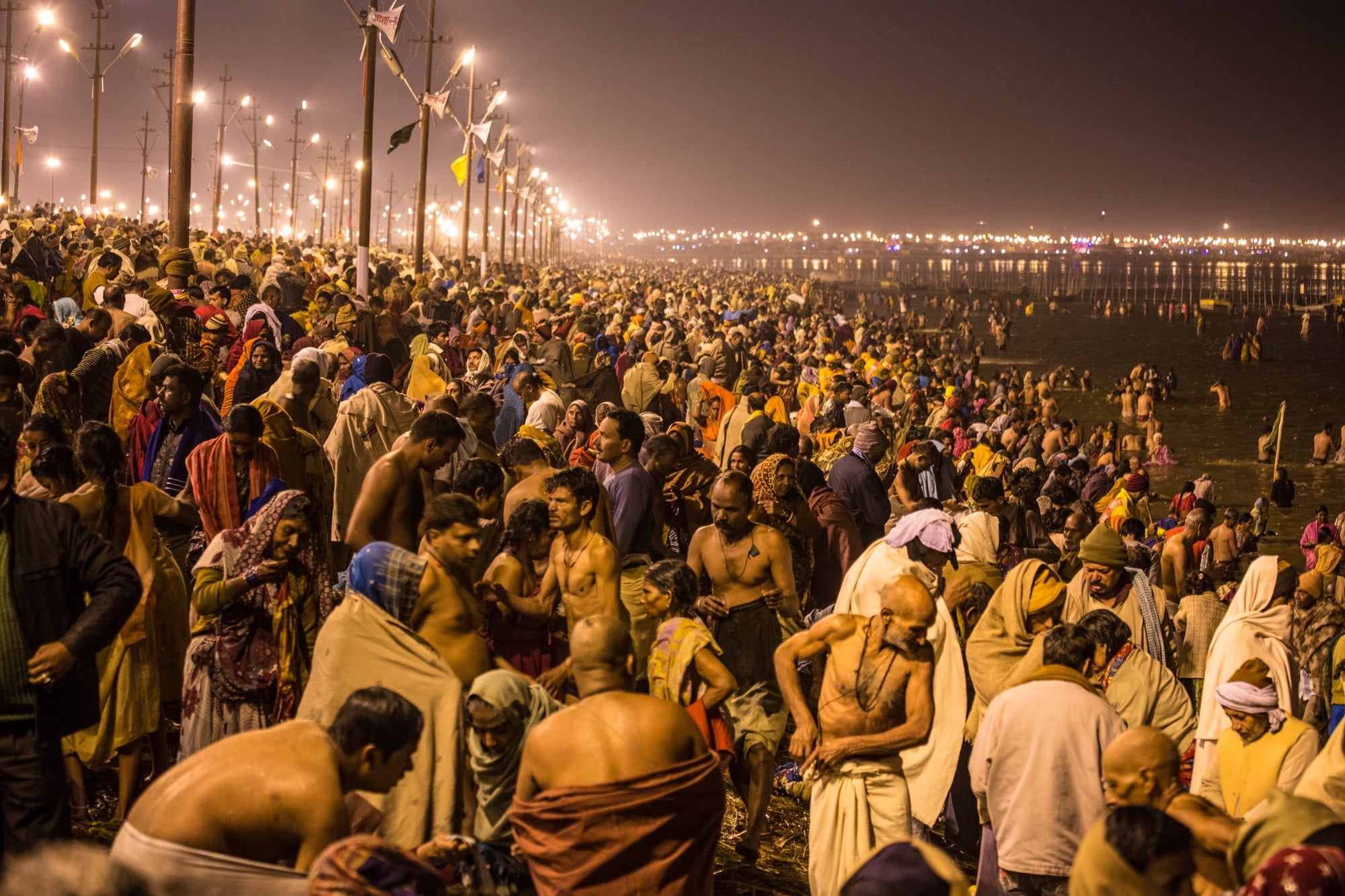 ALLAHABAD, India (January 2013) – Every twelve years, on the flood plains of northern India where the Ganges and Yamuna rivers intersect, the rainy season recedes only to be replaced with a surge of humanity that blankets the plains anew. The occasion is the Maha Kumbh Mela, or the “great urn fair,” a month-long Hindu religious festival that is the single largest public gathering on earth. Tens of millions of people from all walks of life journey to this site to bathe in the rivers, where it is believed the gods spilled an urn containing the elixir of life. The Kumbh Mela is celebrated at rotating sites on a four-year basis, but the festival reaches historic proportions on the twelfth year in Allahabad, when the stars align and it is thought that a dip in the sacred waters can purify the bather of wrongdoing. The human mass is so immense that it can be deciphered from space; in the last Maha Kumbh Mela, upwards of 30 million people participated in one bathing day alone. The 2013 Maha Kumbh Mela is now underway.