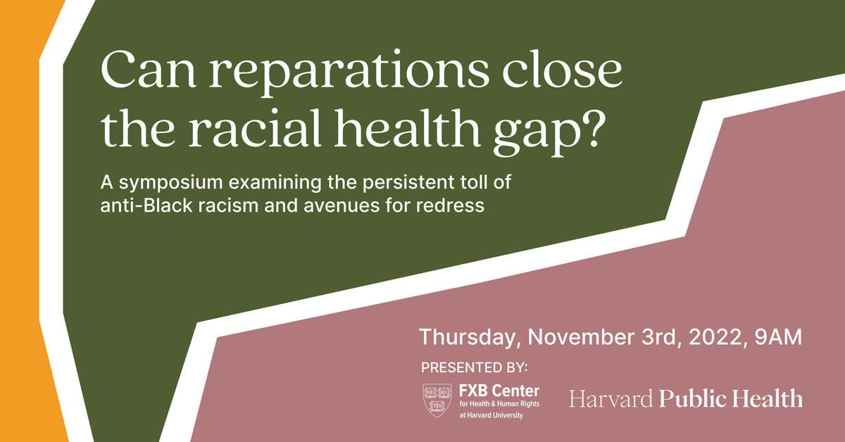 In partnership with Harvard Public Health magazine, the FXB Center for Health and Human Rights hosted a free, in-person symposium at Harvard University’s Martin Center. Throughout the day, we examined the challenging question of how to redress centuries of anti-Black racism – and how to ensure that reparations are designed with the long-term health of Black communities and individuals in mind. Speakers brought a wide range of expertise in law, policy, public health, history, media, and community organizing.